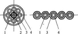 и воспринимается фотодиодом 4, ослабляясь на величину В = = 20lg(Pвх / PBЫX)/l, где Рт Рвых — мощность оптического сигнала на входе и выходе световода; / — длина световода. Ослабление увеличивается при наличии не-однородностей и искривлений световода и достигает максимума, если радиус изгиба становится равным 1/2 длины волны передаваемого сигнала. Однако для большинства материалов световодов ограничением на минимальный радиус изгиба (обычно около 50 мм) является не чрезмерное ослабление сигнала, а растрескивание материала световода. Ослабление для кварцевых световодов составляет не более 2 дБ/км при диаметре световода 200 мкм и радиусах изгиба 50 мм. В качестве материала световодов используют полимеры, стекло, кварц. Световоды поставляются отрезками длиной до 100 м. Отрезки можно сращивать после шлифования торцов склеиванием, нагревом концевых частей и сращиванием под давлением, соединительными металлическими или пластмассовыми втулками, надеваемыми на концевые части сращиваемых отрезков. Оптический кабель состоит из скрученных определенным образом световодов, заключенных в общую защитную оболочку (рис. 5.15, а). По конструктивному исполнению многожильные волоконно-оптические кабели разнообразны и отличаются числом и формой укладки световодов, способом объединения в единую конструкцию, защитой от внешних воздействий. Каждый световод покрывается одно- или двухслойной защитной оболочкой 3. Внешняя защитная оболочка 4 (рис. 5.15) объединяет световоды в единую жесткую конструкцию, обеспечивая защиту от внешних воздействий. Центральная металлическая жила — провод 2 придает оптическому кабелю дополнительную жесткость.
