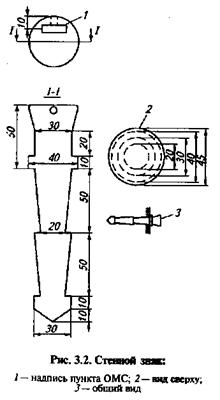 Составной элемент пункта ОМС - марка с нанесенной меткой (просверленное отверстие, пропиленный крест, керн и т. п.), к которой относятся плоские прямоугольные координаты и высоты. На марке над меткой делают надпись «ОМС», а ниже ее наносят номер пункта опорной межевой сети, например надпись на марке пункта ОМС с номером 201 имеет вид: «ОМС/201». Для центра в виде металлической трубы надпись можно помещать на металлической пластине, приваренной к верхней части этого центра. Надписи наносят краской, устойчивой к атмосферным воздействиям, или делают насечку (гравирование). При развитии опорных геодезических сетей на застроенной территории, например в условиях города, в качестве центров пунктов удобно использовать, так называемые, стенные знаки, закрепляемые на зданиях и сооружениях, а также специальные марки, закладываемые на поверхностях в твердом покрытии (например, на поверхности бетонного основания дороги). Пункты ОМС следует, по возможности, размещать на землях, находящихся в государственной или муниципальной собственности, к местам установки пунктов опорных межевых сетей подъезд или подход должны быть легко доступны, хорошо опознаваться на местности и обеспечивать долговременную сохранность их центров. На землях сельскохозяйственного назначения и в сельской местности центры, как правило, закладывают вблизи перекрестков улучшенных грунтовых дорог, опор линий электропередачи и связи, лесных полезащитных полос и т. п. Пункты ОМС закладывают на местности с письменного согласия: