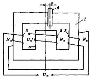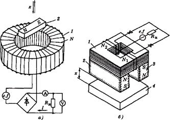 Рис. 5.13 Датчик линейных перемещений (рис. 5.13, б) — это магнитный усилитель с самоподмагничиванием, управляемый полем постоянных магнитов 2 и 3. При перемещении ферромагнитной пластины 4 изменяется магнитное состояние участков магнитопровода 1, на которых размещены рабочие обмотки