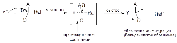 Скорость реакции зависит от концентрации обоих исходных реагентов. Скорость реакции определяется устойчивостью промежуточного состояния и силой нуклеофила (нуклеофильностью) Y.