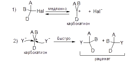 Реакция 1-го порядка: скорость её зависит только от концентрации галогенопроизводного. Растворители: спирты, водно-спиртовые смеси, карбоновые кислоты – хорошо сольватирующие карбокатионы.