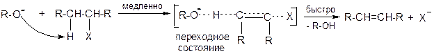 Реакция 2-го порядка: скорость реакции зависит от концентраций и галогенопроизводного, и нуклеофила-основания. По этому механизму происходит дегидрогалогенирование первичных и небольших по объему вторичных алкилгалогенидов.
