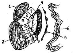 На фронтальном разрезе внутренняя капсула имеет вид косо идущей белой полосы, продолжающейся в ножку мозга. На горизонтальном разрезе – имеет форму угла открытого латерально и состоит из: · передняя ножка – проходят нисходящие пути от коры лобной доли к таламусу и мосту (к собственным ядрам моста) 7,8, · задняя ножка – в переднем отделе идут нисходящие пути пирамидальной системы 10,11; в заднем отделе –чувствительные пути, а также нисходящие пути от коры затылочной и височной долей к мосту 12,13,14. · колено – нисходящие пути пирамидной системы 9.