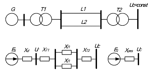 Рассмотрим простейшую схему СЭС, в которой генератор работает через трансформатор и линию на шины неизменного напряжения, т.е. на шины системы, мощность которой настолько велика по сравнению с мощностью генератора, что напряжение на ее шинах можно считать неизменным по амплитуде и фазе при любых режимах.