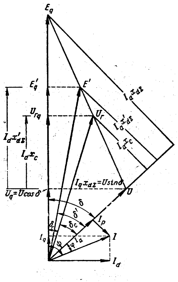 Векторная диаграмма для нормального режима работы этой электропередачи показана на рисунке 1.3, где Еq – ЭДС холостого хода синхронной машины (нет тока статора и соответственно реакции статора), данная ЭДС пропорциональна току ротора; Е' – переходная ЭДС, обусловленная результирующим потокосцеплением, остается неизменной в первый момент при любом резком изменении режима, что связывает предшествующий режим с новым; Е'q - поперечная составляющая или проекция переходной ЭДС Е' на вектор Еq остается неизменной в первый момент при любом резком изменении режима, при расчетах часто полагают Е' δ - угол сдвига по фазе между синхронной ЭДС генератора Еq и напряжением приемной системы Uc. Угол δ - характеризует положение ротора в пространстве. Угол δ не может меняться скачком, и его изменения определяют относительные механические скорости. Из векторной диаграммы (рис. 1.3) и схемы замещения (рис. 1.2) следует, что ЭДС Еq и напряжение UГ на зажимах синхронной машины связаны соотношением Eq = UГ + I·Xd, (1.1)