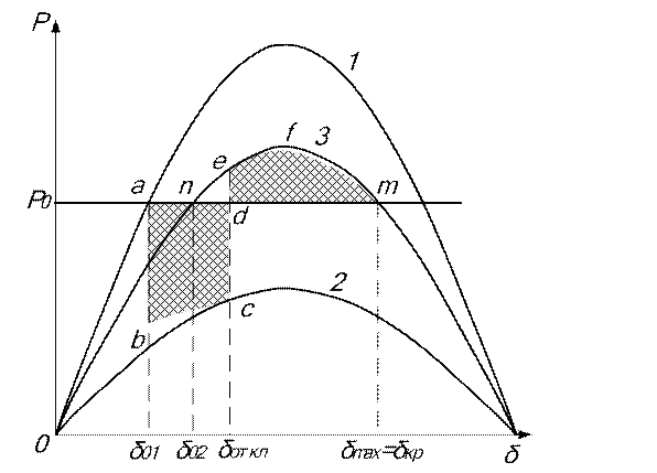На рисунке 3.3 представлены три характеристики режимов: нормального Р1, аварийного Р2 и послеаварийного Р3, то есть режима, в котором аварийный участок отключен. Из рис. 3.3 можно найти предельное значение угла отключения КЗ, при котором устойчивая работа системы сохраняется. Оно определяется равенством площади ускорения