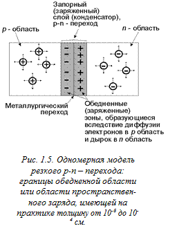 В полупроводнике с областями р - и n -типов, образующими переход, можно выделить следующие пространственные области: металлургический переход (контакт) (воображаемая плоскость, разделяющая р и n - области), область перехода, или область пространственного заряда, или обедненная область (располагается по обе стороны металлургического перехода и имеет толщину от 10-6 до 10-4 см в зависимости от технологии производства), нейтральные области (р и n - области), лежащие между областью пространственного заряда и границами полупроводников р и n - типов, и, наконец, омические контакты, которыми оканчиваются нейтральные области. Основные носители n - области диффундируют в р - область и рекомбинируют с дырками в р - области, вследствие чего и возникает в отрицательный пространственный заряд слева (на рис. 1.5) от металлургического перехода. Аналогичным образом справа от металлургического перехода образуется положительный заряд при диффузии основных носителей р - области в n - область. Возникающее в условиях термодинамического равновесия напряжение в обедненных областях и ведет к прекращению диффузионного тока.