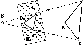 Суть метода заключается в следующем: пусть даны в пространстве треугольник ABC, плоскость П1 и произвольная точка S (рис. 2.2). Проведя из точки S прямые линии (лучи) через вершины треугольника ABC до пересечения их с плоскостью П1, получают точки А1, В1, С1. Эти точки называют центральными проекциями точек А, В, С. Соединив прямыми линиями точки А1, В1, С1, получают центральную проекцию треугольника ABC.