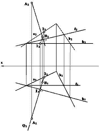 Основание перпендикуляра определяется как точка пересечения его с плоскостью. Для этого нужно провести через нормаль проецирующую плоскость , найти линию пересечения l(l1,l2)-2(21,22) плоскостей Σ и и на пересечении проекции этой линии с проекцией нормали отметить общую точку В для нормали и плоскости.