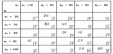 Z1 = 1230; λ = + 10; О4-1 = +10 В вышеприведенном решении (плане), полученном после циклического преобразования исходного опорного решения, значение целевой функции возросло на величину ΔZ = + 100, то есть получено новое решение с увеличенным значением целевой функции. Для того чтобы заранее определить, будет ли вести новое решение, к уменьшению значения целевой функции, мы прибегаем к расчёту оценки свободной клетки на предмет полезности её использования для получения нового опорного решения с уменьшенным численным значением целевой функции. Только в случае, когда выбранная клетка имеет отрицательное значение, то есть со знаком минус, новое решение, полученное на основе проведения алгоритма однократного замещения с выбранной свободной (пустой) клеткой, приведёт к решению с уменьшенным значением целевой функции Zn, (здесь индекс «n» – означает порядковый номер реализуемого алгоритма однократного замещения). 3начение величины λ определяем (см. табл. 9.2.1.) следующим образом: 1)выберем в углах цикла клетку, с наименьшим размером корреспонденции, это будет клетка (1-1) с корреспонденцией λ11= 10; 2) выполним одно преобразование однократного замещения; 3) определим оценку клетки: О4-1 = +4 -4 +7-4+7-2+3-1 = 21-11 = +10 4) далее, можно определить ΔZ1 = λ · О1 = (+10)· (+10) = 100. 5) делаем вывод, что выбранная клетка (4-1) не обеспечивает уменьшение целевой функции Z. (Z1 >Z0), и от преобразования с ней надо отказаться. Выбираем следующую клетку... и так далее, пока не найлём клетку с отрицательной оценкой.