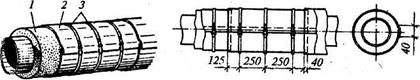 Рис. 20.3. Покрытие трубопроводов фольгоизолом: 1- изоляционный слой; 2 - фольгоизол; 3- бандажи 4. Литая теплоизоляция Литая теплоизоляция предназначена для промышленных печей, холодильников и ее осуществляют обычно из пенобетонной ячеистой массы. Специальную пеномассу и цементный раствор перемешивают в смесителе, полученную готовую массу (пенобетон или газобетон) укладывают при горизонтальных поверхностях в опалубку слоями на высоту до 25 см сразу на всю изолируемую поверхность, послойно уплотняют, наружную поверхность изоляции тщательно разглаживают и разравнивают. На выполненное изоляционное покрытие сверху укладывают рогожу, маты, другие материалы, регулярно поливают водой для обеспечения нормальных условий набора прочности. При вертикальных изолируемых поверхностях пенобетон наносят методом торкретирования по металлической сетке, которая крепится к изолируемой поверхности. Бетонирование производят полосами высотой до 1 м, что исключает оседание бетонной массы и препятствует ее вспучиванию. Последующие полосы бетонирования по вертикали выполняют только по завершении процесса схватывания бетона предыдущих полос. В результате получают изоляцию заданной толщины и конфигурации, плотно прилегающую к изолируемой поверхности и без дефектов (трещин, раковин). Работы по устройству литой изоляции выполняют при температуре не ниже +10 °С. Процесс схватывания и набора прочности осуществляется медленно, критическая прочность достигается только через 5 сут. После приобретения изоляцией проектной прочности сверху наносят слой цементного раствора толщиной 1...2 см и наклеивают рулонную гидроизоляцию. Монолитность изоляции, высокая механическая прочность, пористость — основные достоинства литой изоляции. Как недостатки можно отметить сравнительно высокую плотность, значительный расход цемента, продолжительность процесса устройства и выдержки изоляции, необходимость защиты самой изоляции от влаги. 5. Обволакивающая теплоизоляция Для данного типа изоляции характерно применение гибких материалов и изделий, а именно минерального войлока, алюминиевой фольги и подобных им материалов. Войлок технический грубошерстный изготовляют из смеси шерсти домашних животных. Применяют в качестве теплоизоляции холодных водяных трубопроводов. Материал перед использованием должен быть пропитан антисептиком от моли и антипиреном от возгорания. Изоляцию из минерального войлока устраивают в один или несколько слоев. При однослойной изоляции на изолируемую поверхность закрепляют шпильки, а войлок наматывают путем прокалывания и насаживания на шпильки. Покровный слой из металлической сетки крепят на те же шпильки. Многослойную изоляцию наносят по шпилькам соответствующей длины. Войлок раскатывают с перекрытием внахлестку нижележащих слоев. Сверху, по металлической