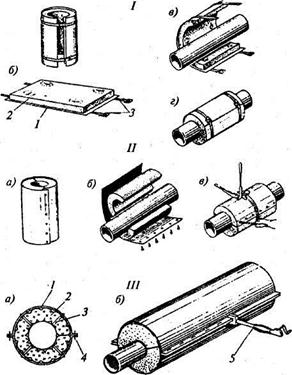 На горизонтальные поверхности теплоизоляцию из плит, панелей и блоков укладывают насухо с заделкой швов, на вертикальных поверхностях изоляцию выполняют в виде кладки стен с перевязкой на цементно-песчаном растворе. Специфические особенности технологии устройства теплоизоляции должны быть оговорены в проекте. Скорлупы и сегменты используют при теплоизоляции трубопроводов. Их укладывают насухо на изолируемую поверхность, плотно пригоняют друг к другу. Наружные швы при необходимости заливают мастикой, а сегменты с двух сторон закрепляют проволочными кольцами или бандажами из полосового железа или алюминия. Для ускорения работ на трубопровод первоначально надевают резиновое монтажное кольцо, под которое