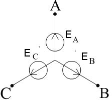 Такая система ЭДС, как показана на схеме, называется - системой прямой последовательности фаз, для нее ЭДС фазы В отстает от ЭДС фазы А, а ЭДС фазы С отстает от ЭДС фазы В (положительный отсчет против часовой стрелки). Любая другая система ЭДС называется – системой обратной последовательности фаз. От последовательности фаз зависит направление вращения ротора трехфазных двигателей.