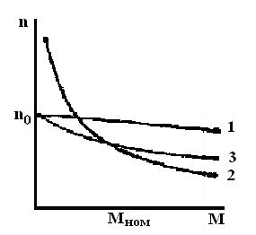 Механическая характеристика является «мягкой». При нагрузках близких к номинальной магнитная система двигателя насыщается, и гипербола переходит в наклонную прямую. График 1 соответствует безреостатному пуску поэтому пусковой момент очень велик и точка Мп0 выходит за переделы графика (это естественная характеристика). При пуске с реостатом ограничивающим пусковой ток до допустимых значений пусковая характеристика (график 2) несколько опускается. При холостом ходе и малых нагрузках ток потребляемый двигателем – небольшой и магнитный поток так же мал. Так как частота вращения двигателя обратно пропорциональна значению магнитного потока, то при холостом ходе и малых нагрузках она в несколько раз превышает номинальную, представляя опасность для целостности двигателя (двигатель идет вразнос). Поэтому эти двигатели нельзя запускать в холостую или при небольшой нагрузке (менее 20-25% от номинальной).