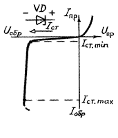 1.p-n переход без подключения внешнего напряжения. В результате перераспределения зарядов на границе возникает двойной электрический слой (Диффузионный ток – электроны из n-области проникают в р-область, а дырки из р-области переходят в n-область). Разноименные заряды создают потенциальный барьер. Однако, в противоположность диффузионному току, создается небольшой дрейфовый ток. Ф установившемся режиме: IΣ = Iдиф + Iдрейф = 0 2. Приложим к р-n-переходу внешнее напряжение (к n-области (+) к p-области (-)) Такое подключение называется обратным, ширина двойного слоя увеличивается, потенциальный барьер возрастает. Кроме того, увеличившийся двойной электрический слой обладает большим электрическим сопротивлением. 3. Приложим к р-n-переходу внешнее напряжение (к n-области (-) к p-области (+)). Получим прямое подключение источника. Потенциальный барьер уменьшается, сопротивление р-n-перехода уменьшается и прямой ток во много раз превышает ток обратного направления. Слайд 4 Диодом называют полупроводниковый прибор с одним n - p -переходом и двумя внешними выводами. По назначению диоды делят на выпрямительные, высокочастотные, импульсные, стабилитроны и т.д. Их изготавливают на основе германия или кремния. Выпрямительные диоды предназначены для преобразования переменного тока низкой частоты в постоянный ток. Вольтамперная характеристика (ВАХ) выпрямительного диода, его условное графическое изображение и буквенное обозначение даны на рис. Слайд 5 Стабилитрон представляет собой кремниевый полупроводниковый диод, который нормально работает при электрическом пробое n - p -перехода. При этом напряжение на диоде незначительно зависит от протекающего тока. Электрический пробой не вызывает разрушения перехода, если ограничить ток до допустимой величины. Стабилитроны применяют для стабилизации постоянного напряжения. ВАХ стабилитрона и его условное графическое обозначение приведены на рис.1.3.