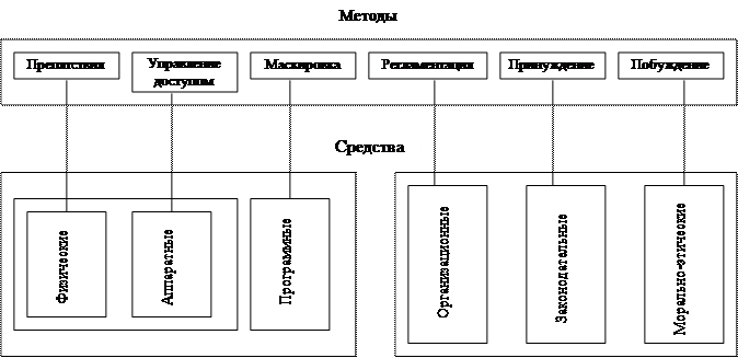 Рис. 12.2 - Методы и средства информационной безопасности экономического объекта Организационное обеспечение – это регламентация производственной деятельности и взаимоотношений исполнителей на нормативно-правовой основе таким образом, что разглашение, утечка и несанкционированный доступ к конфиденциальной информации становятся невозможными или существенно затрудняются за счет проведения организационных мероприятий [101]. Организационное обеспечение компьютерной безопасности включает в себя ряд мероприятий: организационно-административные; организационно-технические; организационно-экономические. В табл. 12.1 изложены организационные мероприятия, обеспечивающие защиту документальной информации.