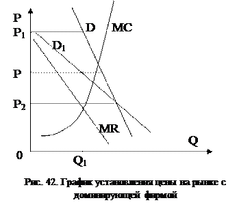 В данной модели отсутствуют любые формы сговора между фирмами, поэтому каждая из них принимает решение самостоятельно. В случае, если одна из фирм решит повысить цену выше Р1 ее спрос изображается кривой D1 выше линии Р1А, конкуренты скорее всего не будут следовать за ней, и их цены либо останутся неизменными, либо вырастут в гораздо меньшей пропорции. При понижении фирмой цены ниже Р1, конкуренты скорее всего последуют за ней (кривая D1 ниже линии Р1А). В результате возникает ломаная кривая спроса D 2 АD1, высокоэластичная выше уровня текущей цены Р1 и малоэластичная ниже ее (рис. 41). Кривая MR при этом не является непрерывной и состоит из двух участков: MR2 выше точки В и MR1 ниже точки С. Кооперированные действия могут быть явные (картель) и неявные (лидерство в ценах). Картель – это юридически оформленное объединение фирм, согласующих свои решения по поводу цен и объемов продукции так, как если бы они слились в чистую монополию. Образование картеля требует выработки совместной стратегии по поводу цен, объемов производства, рынков сбыта, установления квот для каждого участника и создания механизма контроля за выполнением принятых решений. Установление единых монопольных цен повышает выручку всех участников, но рост цен достигается путем обязательного снижения объема продаж. В результате у каждого участника возникает соблазн получить двойной выигрыш: продать свою продукцию по картельной цене, но с превышением низких картельных квот. Если подобного рода поведение станет всеобщим, то картель распадется. В силу ряда факторов это – неустойчивое объединение (различные издержки производства продукции у фирмы, создание контркартелей и др.). Лидерство в ценах основано на неявном, тайном сговоре, когда «господствующая» фирма обычно наиболее крупная или наиболее эффективная в отрасли меняет цену, а все другие фирмы следуют этому изменению. На рис.42 показано, как доминирующая на рынке фирма устанавливает свою цену. D – рыночный спрос, D1 – спрос на товар фирмы-лидера. Лидер определяет свою кривую спроса D1 путем вычисления разности между рыночным спросом и предложением «последователей». Например, при цене Р1 предложение «последователей» равно рыночному спросу, и лидер по этой цене ничего продать не может. При цене Р2 или менее «последователи» не могут предложить товар. И поэтому лидер остается один перед кривой рыночного спроса. При ценах между Р1 и Р2 спрос на продукцию лидера выражается кривой D1. Чтобы максимизировать свою прибыль, лидер осуществляет объем производства Q1, на пересечении MR и МС. По кривой D1 мы находим цену Р. По этой цене на рынке будет продано количество Q2, из них Q1 – продукция фирмы-лидера и (Q2–Q1) – продукция фирм - «последователей». Для описания некооперированных действий служат модель Курно и «дилемма заключенных».