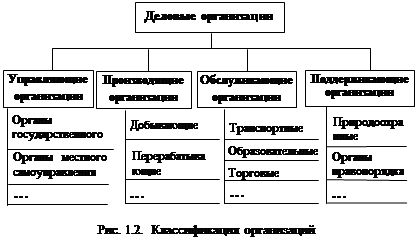 Выделяются следующие основные классы деловых организаций: 1) производящие организации. Их основное назначение — производство материальных благ (товаров, сырья, энергии, оборудования и др.). Внутри этого класса можно выделить подклассы добывающих предприятий, перерабатывающих, сборочных и т.д.; 2) обслуживающиеорганизации предоставляют разнообразные услуги — транспортные, торговые, образовательные, услуги здравоохранения и др.; 3) управляющие организации. Их назначение — управление, руководство другими организациями, обществом в целом. К этому классу относятся органы госуправления (федеральные органы власти), органы местного самоуправления (администрации областей, городов, районов), законодательные органы различных уровней и т.д. 4) поддерживающие организации. Основное назначение этого типа организаций — обеспечение надлежащего порядка, поддержание условий для нормального функционирования общества и устранение препятствий для нормального функционирования. К этому классу организаций можно отнести правоохранительные органы, природоохранные, пожарные, спасательные органы (чрезвычайных ситуаций), вооруженные силы и т.д. Дальнейшая классификация может быть проведена по отраслевому принципу. Приведенная классификация не является полной. Назначения организаций столь многообразны, что полная их классификация по данному признаку требует специальной работы. Однако даже рассмотренная классификация дает некоторые ориентиры, помогающие разобраться в огромном мире социальных организаций.