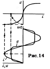 Для побудови кривої Ці операції показані на рис.13 стрілками. По крапках будуємо криву 3. Вона має пікоподібну форму і може бути розкладена на гармоніки. Якщо через нелінійний резистор пропустити синусоїдальний струм, то напруга на ньому матиме несинусоїдальну форму. Відповідні побудови приведені на рис.14. Отже, нелінійний резистор є генератором вищих гармонік напруги. Амплітуди першої і вищих гармонік струмів нелінійно залежать від амплітуд першої і вищих гармонік напруги на нелінійних елементах. Це утрудняє аналіз і розрахунок нелінійних ланцюгів і в той же час дозволяє здійснити з їх допомогою ряд важливих в практичному відношенні перетворень, принципово нездійсненних за допомогою лінійних електричних ланцюгів при незмінних в часі параметрах.