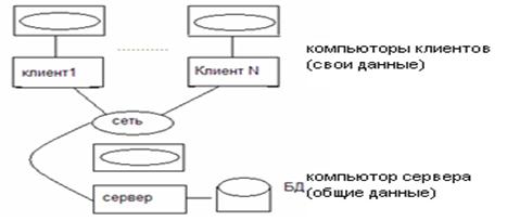 1. Двухзвенная модель распределение функций в модели клиент/сервер. В БД выполняются 3 основные функции: управление данными, обработка и представление. Если эти 3 функции делятся между 2 ЭВМ, то говорят о двухзвенной модели клиент/сервер
