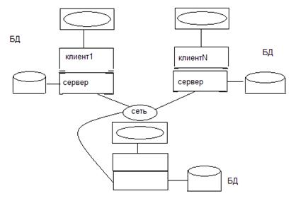 В некоторых случаях, например, для банка весьма вероятно, что пользователям одного отделения банка необходим доступ к данным, сохраняемым в другом отделении. Таким образом, вообще говоря, каждая машина будет выступать в роли сервера для одних пользователей и в роли клиента для других. Иначе каждая машина будет поддерживать полную систему БД.