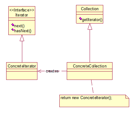 В данном случае, обязанность за создание конкретного экземпляра итератора возлагается на саму коллекцию, таким образом, коллекция является ещё и Factory. Классы, использующие Iterator – пользуются только открытым интерфейсом, получаемым из коллекции. При этом, совершенно не имеет значения какой конкретно итератор в данный момент реализует интерфейс. Примером может служить ResultSet из JDBC API, который позволяет последовательно перебирать результат запроса. При этом, классу-пользователю нет необходимости заботиться о типе и механизмах организации итератора. Это может быть открытый курсор в БД, это может быть локально буферизированная структура, итератор может подгружать данные по мере выдачи их пользователю и т.п. Каждый конкретный итератор, как правило, знает о внутреннем устройстве коллекции, для которой он создаётся, чтобы наиболее эффективно осуществлять навигацию по её элементам. Так, например, итератор для ArrayList знает, что данные в ArrayList хранятся в виде закрытого массива, что позволяет итератору осуществлять быстрый доступ к его элементам. Важно понимать, что помимо итераторов только для чтения, существуют и те, которые предоставляют возможность модификации коллекции, например удаления текущего элемента. Более того, так как итератор представляет собой состояние чтения коллекции, при изменении её состава, это состояние может оказаться неправильным. Например, указатель на текущий элемент у некоего итератора может, в результате удаления из коллекции элемента, находиться за допустимой границей. Для этого, большинством итераторов поддерживается механизм генерации Exception, в случае если в процессе работы итератор замечает, что нижележащая коллекция была изменена из другого потока.