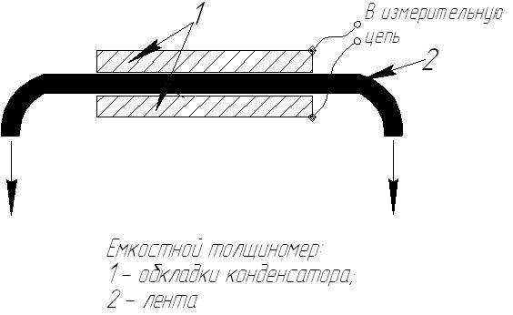 Емкостный преобразователь представляет собой конденсатор, емкость которого изменяется под действием измеряемой неэлектрической величины. В качестве емкостного преобразователя широко используют плоский конденсатор, емкость которого можно выразить формулой: Так как измеряемая неэлектрическая величина может быть функционально связана с любым из этих параметров, то устройство емкостных преобразователей может быть самым различным в зависимости от области применения. Толщиномер. На рис. представлен принцип действия емкостного толщиномера, измеряющего толщину ленты 2 из диэлектрика (например, резины).