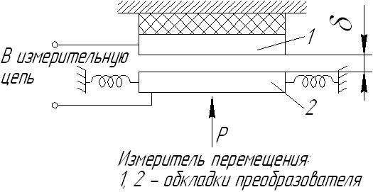 Зазор Схемы с дифференциальным преобразователем имеют большую чувствительность и точность. Обкладка 2 закреплена на пружинах и перемещается параллельно самой себе под воздействием измеряемой силы Р. Обкладки 1 и 3 неподвижны. Емкость между обкладками 2 и 3 увеличивается, а между обкладками 7 и 2 уменьшается.