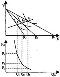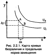 На рис. 2.3.1 точка касания бюджетной линии (Е) с самой высокой кривой безразличия определяет равновесие потребителя, точки А и В не являются равновесными, т.к. пересекаются с более низкой кривой безразличия. MRSx,y < 0 const, в точке (Е) потребитель максимизирует удовлетворение от потребления и покупки товаров х и у. В точке (Е), где угол наклона кривой безразличия (MRSx,y), равен углу наклона бюджетной линии (Рх/Ру), возникает равновесие потребителя. Условие потребительского равновесия:
