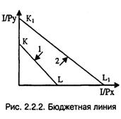 Изменение соотношения цен на товары изменяет угол наклона бюджетной линии (1) на рис. 2.2.2. При изменении дохода потребителя бюджетная линия смещается в соответствующую сторону и занимает положение параллельное первоначальному (2) на рис. 2.2.2.