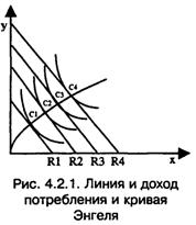 Если одновременно снижается Рх и Ру, то это означает увеличение реального дохода потребителя и равномерное смещение бюджетной линии вправо. CI, С2, СЗ, С4 — параметры рыночного равновесия при различных уровнях дохода. Соединив их, получим линию «доход-потребление» (рис. 4.2.1). Кривая «доход-потребление» связывает точки равновесия и показывает, как потребление товаров x и y изменяется с ростом дохода.