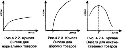 Для нормальных благ кривая «доход-потребление» имеет положительный наклон, для некачественных товаров — отрицательный наклон, для нейтральных товаров она вертикальна. Зависимость объема спроса на благо от дохода потребителя в графическом виде называется кривой Энгеля. Кривая Энгеля для нормальных товаров с неэластичным по доходам спросом изображена на рисунке 4.2.2. Кривая Энгеля для высококачественных и дорогих товаров и услуг, предметов роскоши (рис. 4.2.3). Если доход меньше, чем I, то благо вообще недоступно. Кривая Энгеля для некачественных товаров: потребление их растет, пока доход не достигнет уровня I (рис. 4.2.4).