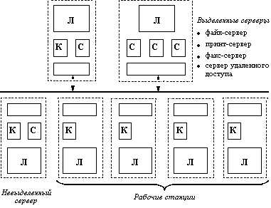 Сеть с выделенным сервером. Если компьютер предоставляет свои ресурсы другим пользователям сети, то он играет роль сервера. При этом компьютер, обращающийся к ресурсам другой машины, является клиентом. Как уже было сказано, компьютер, работающий в сети, может выполнять функции либо клиента, либо сервера, либо совмещать обе эти функции. Если выполнение каких-либо серверных функций является основным назначением компьютера (например, предоставление файлов в общее пользование всем остальным пользователям сети или организация совместного использования факса, или предоставление всем пользователям сети возможности запуска на данном компьютере своих приложений), то такой компьютер называется выделенным сервером. В зависимости от того, какой ресурс сервера является разделяемым, он называется файл-сервером, факс-сервером, принт-сервером, сервером приложений и т.д. На выделенных серверах желательно устанавливать ОС, специально предназначенные для выполнения тех или иных серверных функций. Примером ОС, ориентированной на построение сети с выделенным сервером, является операционная система Windows NT. Оба варианта данной сетевой ОС - Windows NT Server (для выделенного сервера) и Windows NT Workstation (для рабочей станции) - могут поддерживать функции и клиента и сервера. Но серверный вариант Windows NT имеет больше возможностей для предоставления ресурсов своего компьютера другим пользователям сети, так как может выполнять более широкий набор функций. Он поддерживает большее количество одновременных соединений с клиентами, реализует централизованное управление сетью, имеет более развитые средства защиты. Выделенный сервер не принято использовать в качестве компьютера для выполнения текущих задач, не связанных с его основным назначением, так как это может уменьшить производительность его работы как сервера. Но в некоторых сетевых ОС функционирование на выделенном сервере клиентской части вполне возможно. Например, под управлением Windows NT Server могут запускаться обычные программы локального пользователя, которые могут потребовать выполнения клиентских функций ОС при появлении запросов к ресурсам других компьютеров сети. При этом рабочие станции, на которых установлена ОС Windows NT Workstation, могут выполнять функции невыделенного сервера. Несмотря на то, что в сети с выделенным сервером все компьютеры в общем случае могут выполнять одновременно роли и сервера, и клиента, эта сеть функционально не симметрична: в ней реализованы два типа компьютеров. Одни, в большей степени ориентированные на выполнение серверных функций и работают под управлением специализированных серверных ОС, а другие - в основном выполняют клиентские функции и работают под управлением соответствующего этому назначению варианта ОС. Такая несимметричность функций, как правило, вызывает и несимметричность аппаратуры - для выделенных серверов используются более мощные компьютеры с большими объемами оперативной и внешней памяти (специализация компьютеров). Следовательно, должны быть несимметричны и ОС (специализация ОС). В одноранговых сетях все компьютеры равны в правах доступа к ресурсам друг друга. Каждый пользователь может по своему желанию объявить какой-либо ресурс своего компьютера разделяемым, после чего другие пользователи могут его эксплуатировать. В таких сетях на все