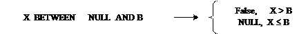 2) Якщо вираз, що визначає нижню границю діапазону має значення NULL, то перевірка BETWEEN... AND… дає результат FALSE у випадку, коли вираз, що перевіряється, має значення, більше ніж значення верхньої границі діапазону; і дає результат NULL в іншому випадку: