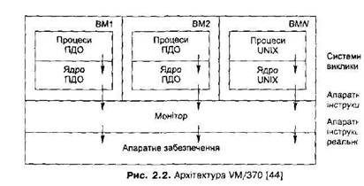 Рис. 2.1. Виконання системного виклику в архітектурі з мікроядром Головним недоліком мікроядрового підходу є зниження продуктивності. Замість двох перемикань режиму процесора у разі системного виклику відбувається чотири (два – під час обміну між клієнтом і мікроядром, два – між сервером та мікроядром). Зазначений недолік є, швидше, теоретичним, на практиці продуктивність і надійність мікроядра залежать насамперед від якості його реалізації. Так, в ОС QNX мікроядро займає кілька кілобайтів пам’яті й забезпечує мінімальний набір функцій, при цьому система за продуктивністю відповідає ОС реального часу. 2.2.4. Концепція віртуальних машин У системах віртуальних машин програмним шляхом створюють копії апаратного забезпечення (відбувається його емуляція). Ці копії (віртуальні машини) працюють паралельно, на кожній із них функціонує програмне забезпечення, з яким взаємодіють прикладні програми і користувачі. Уперше концепція віртуальних машин була реалізована в 70-ті роки в операційній системі VM фірми IBM. У СРСР варіант цієї системи (VM/370) був широко розповсюджений у 80-ті роки і мав назву Система віртуальних машин ЄС ЕОМ (СВМ ЄС). Розглянемо архітектуру цієї ОС [8,44], що показана на рис. 2.2. Ядро системи, яке називалося монітором віртуальних машин (VM Monitor, МВМ), виконувалося на фізичній машині, безпосередньо взаємодіючи з її апаратним забезпеченням. Монітор реалізовував набір віртуальних машин (ВМ). Кожна ВМ була точною копією апаратного забезпечення, на ній могла бути запущена будь-яка ОС, розроблена для цієї архітектури. Найчастіше на ВМ встановлювали спеціальну однокористувацьку ОС CMS (підсистема діалогової обробки, ПДО). На різних ВМ могли одночасно функціонувати різні ОС. Коли програма, написана для ПДО, виконувала системний виклик, його перехоплювала копія ПДО, запущена на відповідній віртуальній машині. Потім ПДО виконувала відповідні апаратні інструкції, наприклад інструкції в ведення-виведення для читання диска. Ці інструкції перехоплював МВМ і перетворював їх на апаратні інструкції фізичної машини.