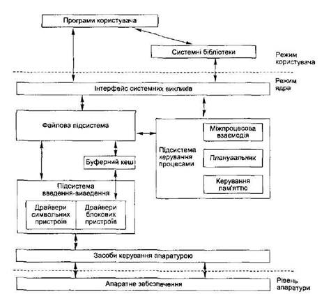 Рис. 2.3. Архітектура UNIX Сучасні UNIX-системи дещо відрізняються за своєю архітектурою. · У них виділено окремий менеджер пам’яті, відповідальний за підтримку віртуальної пам’яті. · Стандартом для реалізації інтерфейсу файлової системи є віртуальна файлова система, що абстрагує цей інтерфейс і дає змогу організувати підтриму різних типів файлових систем. · У цих системах підтримується багатопроцесорна обробка, а також багатопотоковість. Базові архітектурні рішення, такі як доступ до всіх пристроїв введення-виведення через інтерфейс файлової системи або організація системних викликів лишаються незмінними в усіх реалізаціях UNIX. 2.4.2. Архітектура Linux В ОС Linux можна виділити три основні частини: · ядро, яке реалізує основні функції ОС (керування процесами, пам’яттю, введенням-виведенням тощо); · системні бібліотеки, що визначають стандартний набір функцій для використання у застосуваннях (виконання таких функцій не потребує переходу в привілейований режим); · системні утиліти (прикладні програми, які виконують спеціалізовані задачі). Призначення ядра Linux і його особливості Linux реалізує технологію монолітного ядра. Весь код і структури даних перебувають в одному адресному просторі. У ядрі можна виділити кілька функціональних компонентів [63]. · Планувальник процесів – відповідає за реалізацію багатозадачності в системі (обробка переривань, робота з таймером, створення і завершення процесів, перемикання контексту). · Менеджер пам’яті – виділяє окремий адресний простір для кожного процесу і реалізує підтримку віртуальної пам’яті. · Віртуальна файлова система – надає універсальний інтерфейс взаємодії з різними файловими системами та пристроями введення-виведення. · Драйвери пристроїв – забезпечують безпосередню роботу з периферійними пристроями. Доступ до них здійснюється через інтерфейс віртуальної файлової системи. · Мережний інтерфейс – забезпечує доступ до реалізації мережних протоколів і драйверів мережних пристроїв. · Підсистема міжпроцесової взаємодії – пропонує механізми, які дають змогу різним процесам у системі обмінюватися даними між собою. Деякі із цих підсистем є логічними компонентами системи, вони завантажуються у пам’ять разом із ядром і залишаються там постійно. Компоненти інших підсистем (наприклад, драйвери пристроїв) вигідно реалізовувати так, щоб їхній код міг завантажуватися у пам’ять на вимогу. Для розв’язання цього завдання Linux підтримує концепцію модулів ядра. Модулі ядра Ядро Linux дає можливість на вимогу завантажувати у пам’ять і вивантажувати з неї окремі секції коду. Такі секції називають модулями ядра (kernel modules) [ЗО] і виконують у привілейованому режимі. Модулі ядра надають низку переваг. · Код модулів може завантажуватися в пам’ять у процесі роботи системи, що спрощує налагодження компонентів ядра, насамперед драйверів. · З’являється можливість змінювати набір компонентів ядра під час виконання: ті з них, які в цей момент не використовуються, можна не завантажувати у пам’ять. · Модулі є винятком із правила, за яким код, що розширює функції ядра, відповідно до ліцензії Linux має бути відкритим. Це дає змогу виробникам апаратного забезпечення розробляти драйвери під Linux, навіть якщо не заплановано надавати доступ до їхнього вихідного коду. Підтримка модулів у Linux складається із трьо