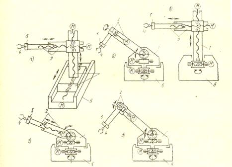 Кинематическая структура ПР выражается следующей формулой: Р=Р0+Рр+Рк, где Р — общее число степеней свободы (количество различных движений); Ро, Рр и Рк — степени свободы основания, «руки» и «кисти». Достаточно универсальными являются ПР, если Р=5 Захваты делаются в виде клещей, цанг (при зажиме за отверстие в изделии), электромагнитов или пневматических присосков. Приводы основания, «руки» и «кисти» ПР могут быть электрическими, гидравлическими и пневматическими. Промышленные роботы могут выполнять различные операции: захватывать изделия, менять их положения в пространстве, перемещать и помещать их в определенное место, закреплять и т.п. Благодаря своей широкой универсальности, сравнительно легкой переналаживаемости, высокой надежности и открывающимся при их использовании новым возможностям автоматизации производственных процессов промышленные роботы начинают все шире применяться в различных отраслях промышленности как в Советском Союзе, так и за рубежом. За рубежом наибольшее применение промышленные роботы нашли в таких странах, как США, Англия и Япония. Одним из роботов 2-го поколения можно назвать адаптивный робот фирмы «Hitachi» (Япония)1,