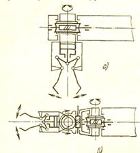 В последнем случае основание ПР устанавливается на тележку, которая движется по рельсам вдоль фронта перегрузочных работ. 4. Выполняются одно поступательное и два вращательных движения. При этом «рука» имеет возможность перемещать груз в объемно-сферической зоне с неподвижной осью сферы (рис. 10.1 г, д) или подвижной при установке ПР на тележке. Последние три схемы имеют наибольшую универсальность и могут быть рекомендованы при конструировании ПР для перегрузочных, упаковочных и складских операций. Если грузы заранее не ориентированы относительно их конечной позиции, то приводятся во вращение «кисти руки» ПР. Кинематика «кисти» позволяет изменять ориентацию груза без изменения положения «руки». На рис. 10,12 а показана кинематическая схема «кисти» с двумя степенями свободы — одно вращательное движение и одно поступательное. Поступательное движение предназначено для зажима и разжима клещевого захвата. Такая схема пригодна для перегрузки грузов, ориентированных в одной из плоскостей — вертикальной или горизонтальной. Для полностью неориентированных грузов надо использовать кисть с двумя вращательными и одним поступательным движениями (рис. 10.12 б).
