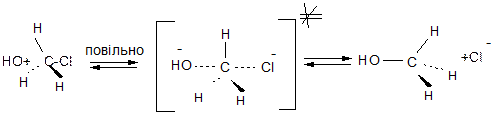 Спочатку повільно відбувається дисоціація з утворенням енергетично стійкого бензильного катіона, стійкість якого зумовлена спряженням