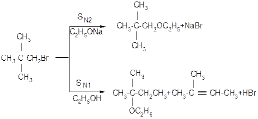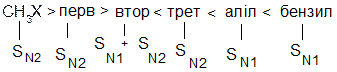 ІІІ. Порівняння реакцій SN1 та SN2. Нуклеофільне заміщення SN1 супроводжується рацемізацією та перегрупуванням, а реакційна здатність зменшується від третинних до первинних галагенопохідних. Для SN2 реакцій характерне повне обертання конфігурації, відсутність перегрупування, а реакційна здатність зменшується від первинних до третинних галагенопохідних. Оскільки порядок зміщення реакційної здатності в реакціях SN1 та SN2 різна, кожна з них зустрічається в чистому вигляді дуже рідко, в дійсності спостерігається комбінація обох реакцій з більшою або меншою часткою кожної з них. Тому для галогеналканів типовим є присутність мінімуму в реакційній здатності: