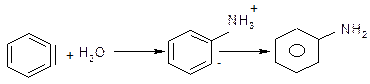 Дегідробензол має ароматичний характер, але, водночас, і потрійний зв’язок. При цьому, одна пара електронів потрійного зв’язку входить до π-електронного секстету бензольного кільця, а інша пара електронів утворює “π- зв’язок”, який розташований в площині бензольного кільця. Цей зв’язок надзвичайно реакційноздатний внаслідок слабкого перекривання двох sp2-гібридизованих електронних орбіта лей і легко вступає в реакції нуклеофільного приєднання (третю стадію реакції):