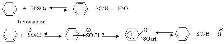 Дійсна будову атому сірки – проміжна між станами, які відповідають цим двом формам (Див. “ мезомерна структура ”). Ароматичні сульфокислоти добувають переважно реакцією сульфування ароматичних сполук сульфуючими реагентами (концентрована H2SO4, олеум: SO3+H2SO4; SO3; хлорсульфонова кислота HОSO2Cl; хлористий сульфурил SO2Cl2 , та інш.). Сульфування – це реакція електрофільного заміщення. При сульфуванні сірчаною кислотою сульфуючою частинкою є катіон гідросульфонію, який утворюється з концентрованої кислоти за схемою: