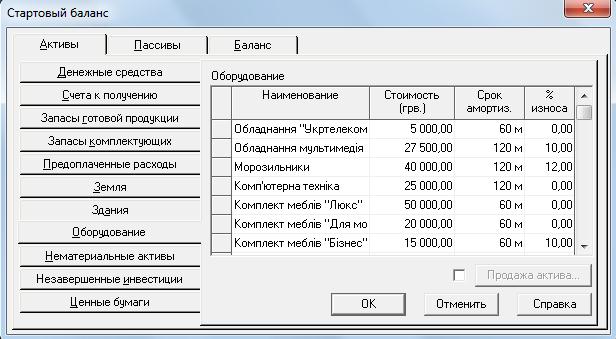 У модулі Настройка расчета на вкладці Детализация встановіть всі прапорці. При виборі перерахованих таблиць в результатах можна буде подивитись значення вказаних показників. У модулі Текстовое описание вводиться загальна інформація про мету та стратегію розвитку підприємста. Розділ Компания Опис початкового фінансового стану діючого або знову створеного підприємства проводиться у пункті «Стартовий баланс», у якому детально описуються всі основні статті активів і пасивів балансу на дату старту проекту. Діалог «Стартовий баланс» складається із двох розділів: «Активи» і «Пассивы». Перемикання між цими розділами здійснюється натисканням на закладки у верхній частині діалогу. Розділ «Активи» містить наступні картки: Денежные средства; Счета к получению; Запасы готовой продукции; Запасы сырья, материалов и комплектующих; Предоплаченные расходы; Земля; Здания; Оборудование; Нематериальные активы; Незавершенные инвестиции; Инвестиции в ценные бумаги. При формуванні розділу «Активи» заповнюються ті картки, по яких існують активи. Наприклад, при формуванні моделі нового підприємства, запаси готової продукції, сировини, матеріалів і комплектуючих відсутні.