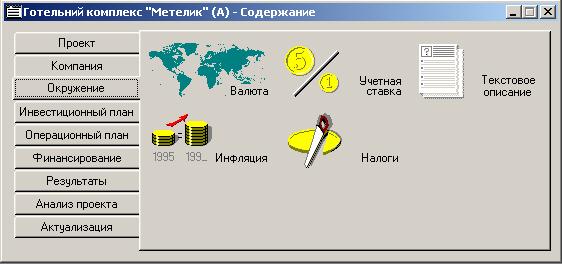 Рисунок 6.5 – Картка обладнання Розділ Окружение Для опису фінансово-економічного середовища, у якому планується реалізація проекту, призначений розділ Окружение, що активізується вибором закладки Окружение у діалоговому вікні Содержание. Цей розділ містить 5 модулів (рис 6.6): валюта; учетная ставка; текстовое описание; инфляция; налоги, у яких уводяться дані по основній (національній) і додатковій (експортно-імпортної) валютах проекту; ставці рефінансування; а також інфляційному й податковому оточенні фінансових операцій проекту.