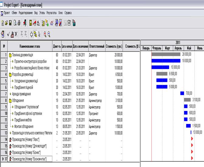 - Створіть виробництво за допомогою кнопки на панелі інструментів Для вказування послідовності виконання етапів використовується інструмент При вказування послідовності виконання етапів можуть змінюватися значення тривалості етапів. Для їх корегування наведіть показчик миші на правий край синіх ліній на графіку і протягніть їх до потрібного значення.