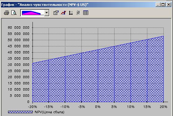 Графічне відображення результатів аналізу чутливості викликається кнопкою «График». На графіку можна відбити кілька ліній одночасно, попередньо виділивши в підсумковій таблиці групу суміжних рядків. Всі лінії одного графіка показують зміну того самого показника ефективності. Але кожна лінія відображає вплив окремого параметра. На рис. 6.15 наведений графік впливу показника ціни збуту на NPV проекту «Метелик». Із графіка видно, що NPV проекту перебуває в сприятливій зоні, тому що крива NPV проходить вище осі абсцис.
