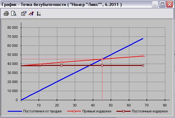 Модуль «Анализ безубыточности» досліджує залежність витрат і виторгу від обсягу збуту, показує обсяги збуту, при яких витрати повністю перекриються доходами від продажів продукції. Увага! Доступ до діалогу «Анализ безубыточности» закритий, якщо не виконано попереднє настроювання у двох інших модулях: 1. По-перше, у розділі «Проект», модуля «Настройка расчета» у картці «Детализация» необхідно встановити прапорець «Разнесение издержек». 2. По-друге, необхідно ввести дані про засоби віднесення постійних витрат на продукти в модулі " Разнесение издержек" розділа «Аналіз проекта». Але якщо не виконано перше настроювання, то даний метод недоступний. Для графічного відображення беззбитковості необхідно вибрати конкретну числову клітку таблиці та натиснути кнопку «Показать». При цьому на графіку (рис. 6.17) автоматично відображається динаміка прибутку (праворуч від крапки беззбитковості) і збитку (ліворуч від крапки беззбитковості) залежно від обсягу продажів продукту або послуги.