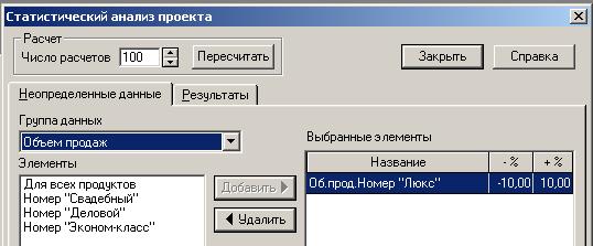 Модуль «Монте-Карло» дозволяє провести статистичний аналіз проекту методом Монте-Карло з метою визначення ступеня можливого впливу випадкових факторів на показники ефективності проекту. Цей модуль реалізує методи статистичних випробувань і методи математичного експериментування. Модуль може працювати з неточними, слабко певними даними (обсяг збуту, ціна продукції, інфляція й т.д.), які можуть розглядатися як випадкові фактори, що впливають на результат проекту. Для реалізації даного методу необхідно: 1. Мати модель процесу. 2. Виділити параметри, що мають невизначеність. 3. Установити припустимий діапазон випадкової зміни значень для кожного невизначеного параметра. 4. Задати кількість перерахувань проекту з випадковими значеннями зазначених параметрів. Далі комп'ютер автоматично виконує серію ітерацій. У ході кожної ітерації із заданого діапазону випадковим образом програма вибирає значення невизначених параметрів. Отримана сукупність результатів вивчається статистичними методами, і робляться висновки про поводження фінансової моделі в умовах дії випадкових факторів. Кількісна оцінка статистичних результатів здійснюється по двох критеріях: середньому значенню й невизначеності (коефіцієнту варіації). Чим вище коефіцієнт варіації, тим вище ризик дефіциту коштів. Прийнятним значенням коефіцієнта варіації вважається 15%. На рис. 6.18 представлений інструментарій методу Монте-Карло. Діалог «Статистический анализ проекта» служить для настроювання дослідження дії випадкових факторів на результати реалізації проекту. У верхній частині цього діалогу вказується число необхідних ітерацій. У картці «Неопределенные данные» з лівого списку груп даних підсписку елементів групи відбирають необхідні дані. За допомогою кнопок «Добавить», «Удалить» дані заносяться в список «Выбранные элементы». Після цього активізується кнопка «Пересчитать», і починаються автоматичні машинні експерименти.