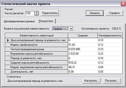 Рисунок 6.18 - Вікно діалогу «Статистический анализ проекта» На рис. 6.19 наведені дані статистичного аналізу проекту «Метелик». За всіма показниками коефіцієнт варіації не перевищує 15%. Це означає, що величина ризику дефіциту коштів проекту мінімальна.