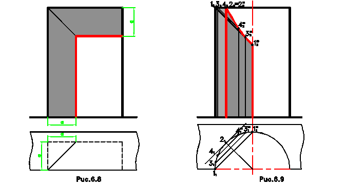 Ниши являются архитектурной формой, часто используемой на практике и представляющие собой внутренние поверхности призм, цилиндров, конусов и сфер. На рис.6.8 представлена призматическая ниша. Падающие тени от контура ниши (он же контур собственной тени) на внутреннюю поверхность задней грани призмы, являющейся фронтальной плоскостью, строятся по «выносу», который равен глубине ниши. На рис.6.9 представлена цилиндрическая ниша с открытым верхом. Строится собственная тень цилиндра известным способом. Затем строятся падающие тени от контура собственной тени ниши, состоящего из левой вертикальной прямой и дуги окружности от точки 1 до точки 2. Падающая тень от вертикальной прямой на цилиндрическую поверхность падает на образующую, совпадающую с осью.